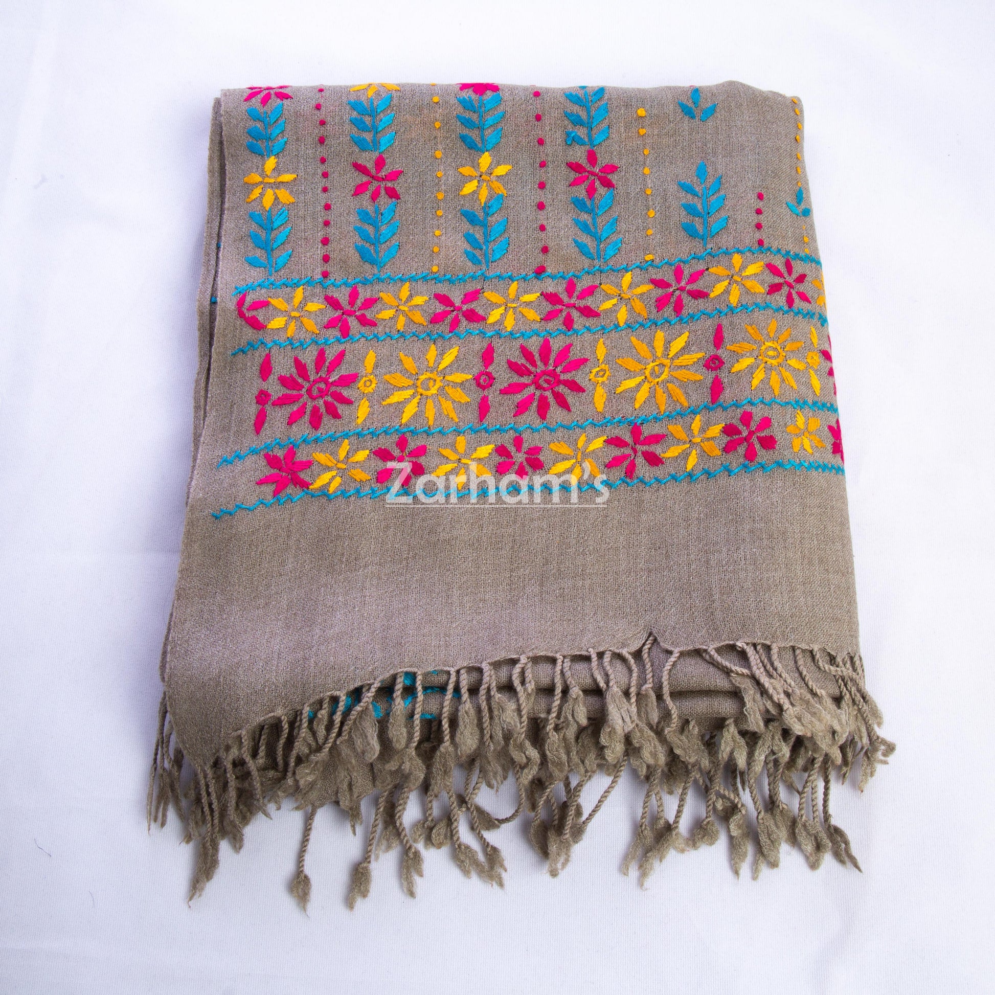 Handmade Pure Woolen Shawl with Multicolor Embroidery & Heavy Border