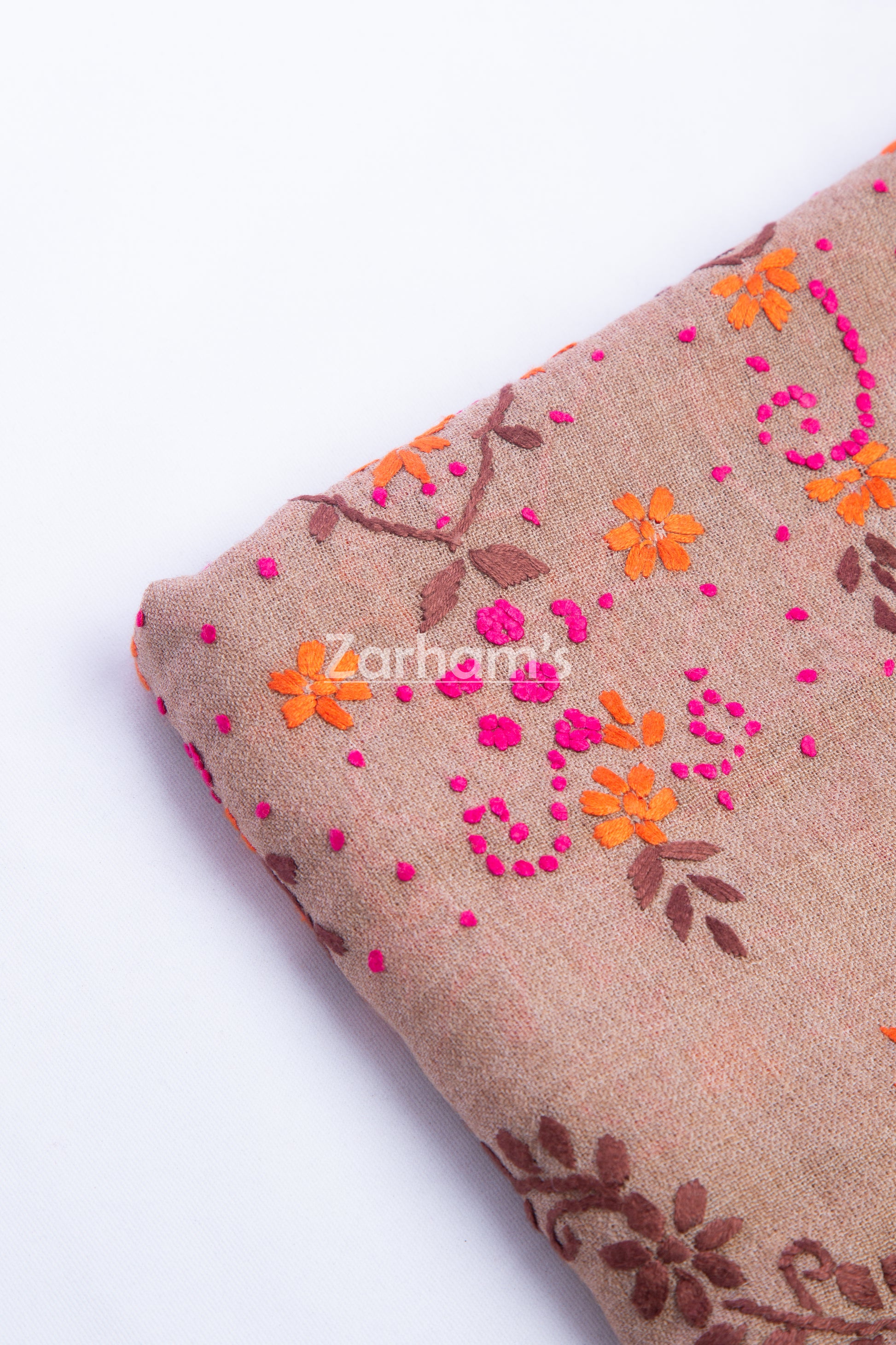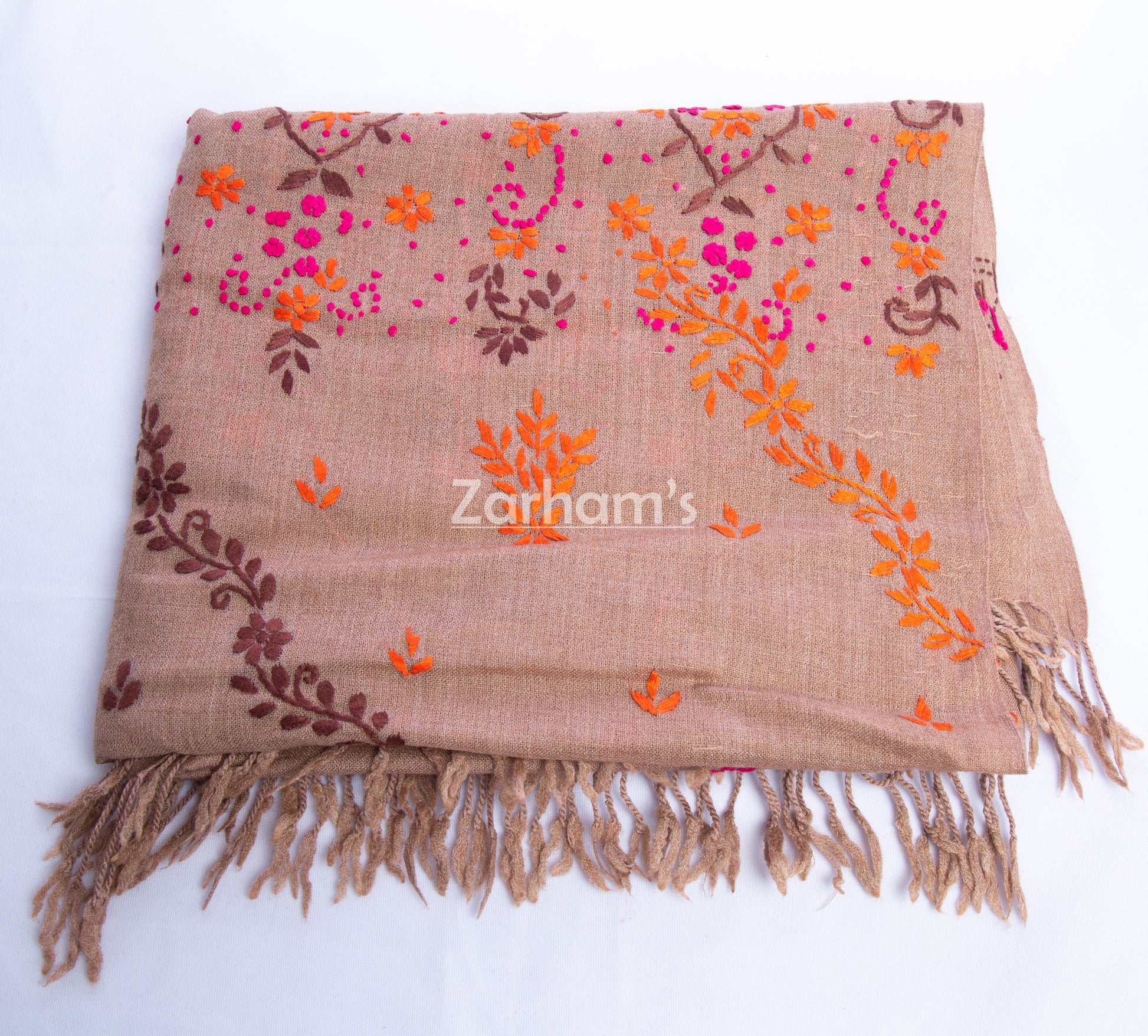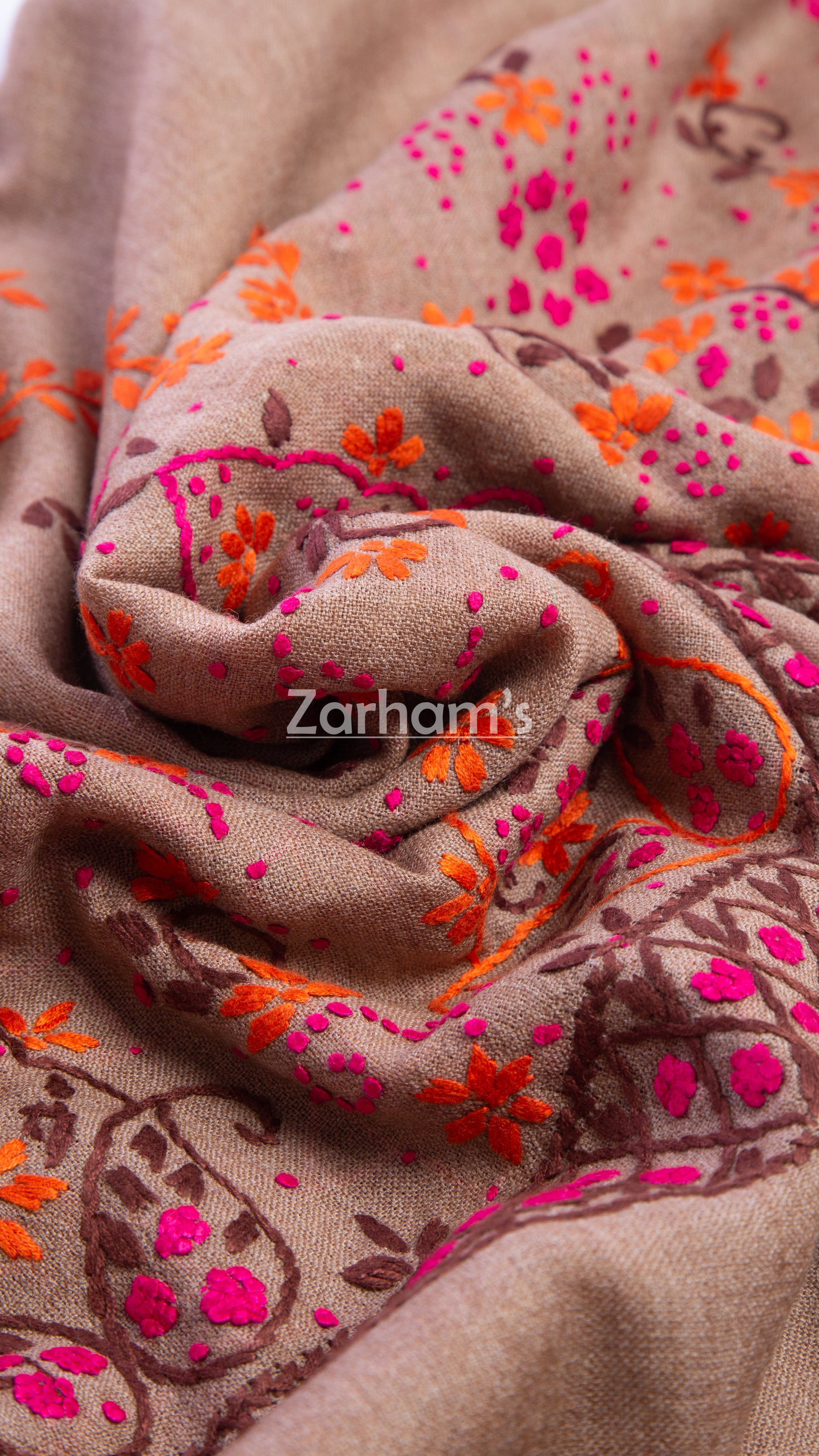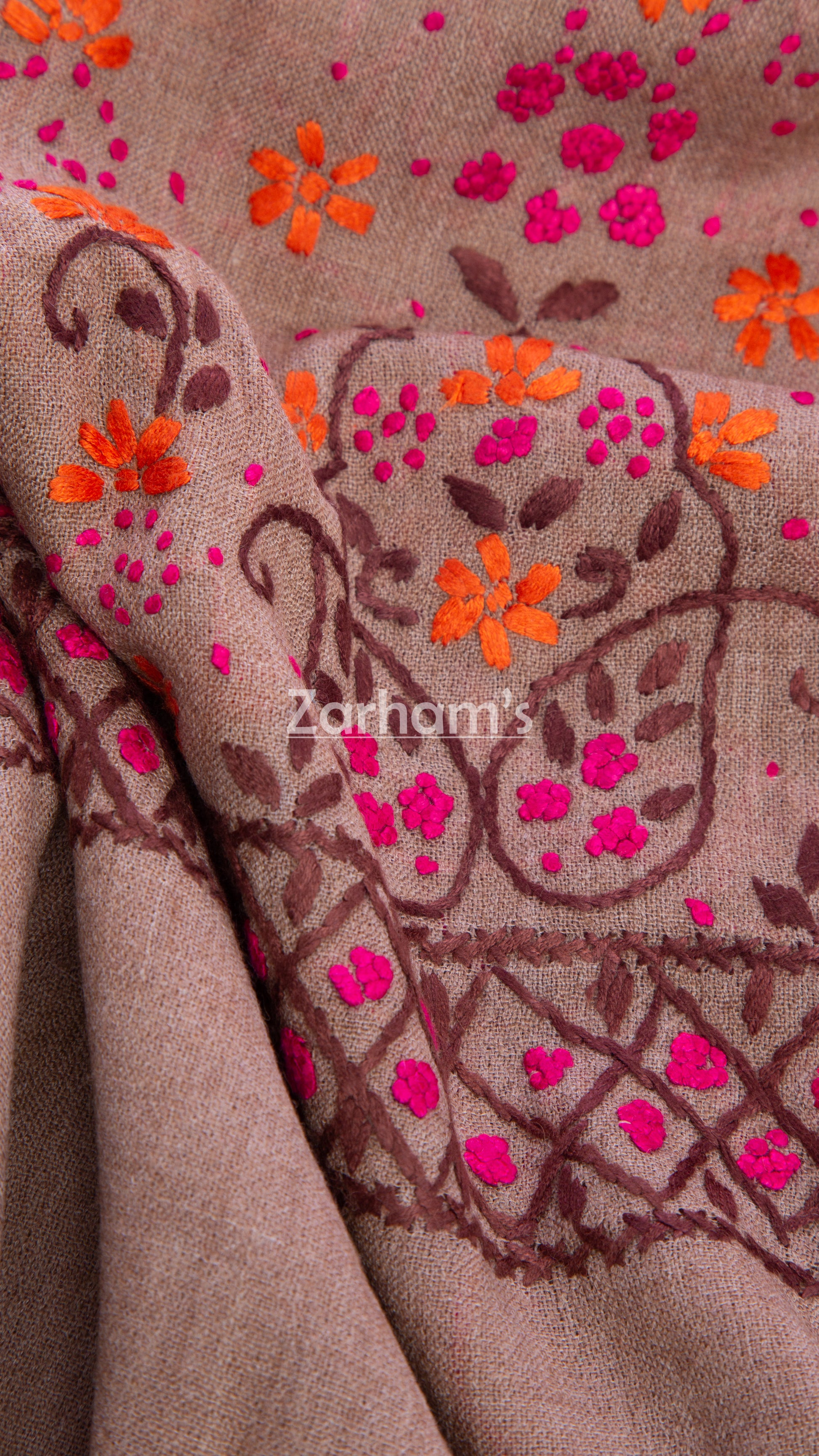 Wrap yourself in timeless elegance with our 100% handmade premium-quality pure woolen shawl, crafted in a rich Brown hue and adorned with intricate multicolor embroidery. Finished with delicate net work and a striking heavy border, this winter essential blends heritage craftsmanship with sophisticated style.