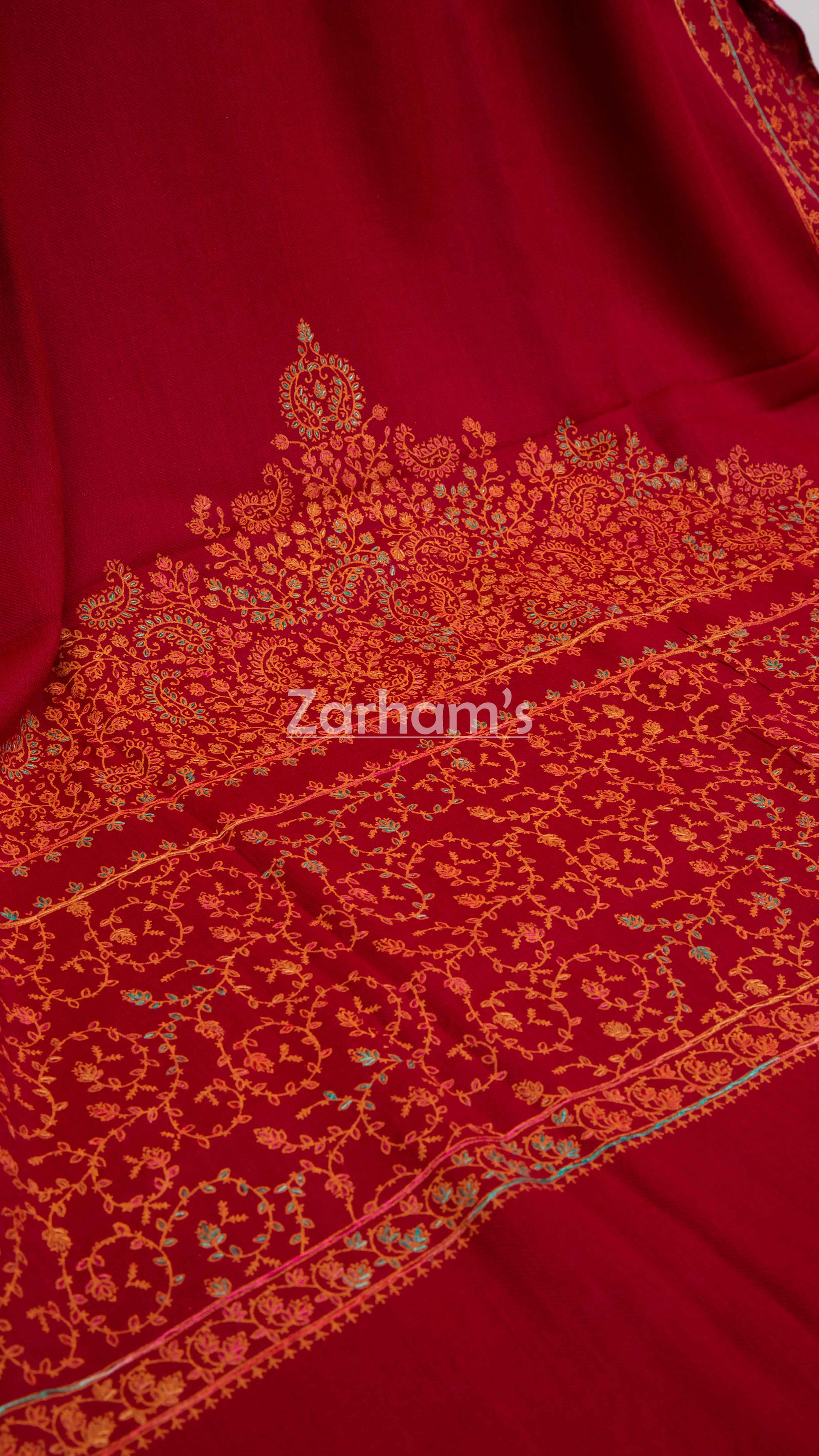 Wrap yourself in timeless elegance with our 100% handmade premium-quality pure woolen shawl, crafted in a rich Red hue and adorned with intricate multicolor embroidery. Finished with delicate net work and a striking heavy border, this winter essential blends heritage craftsmanship with sophisticated style.