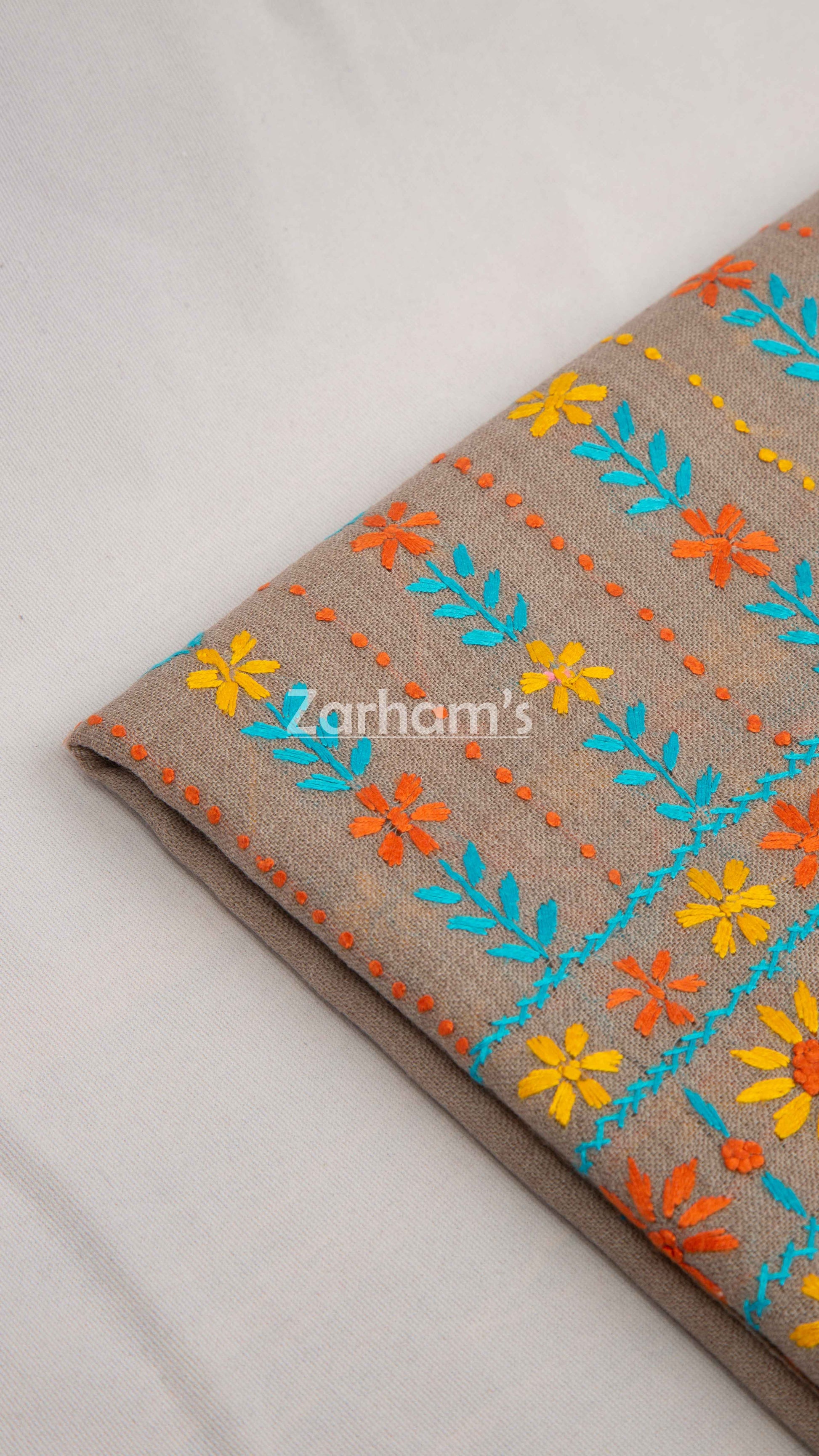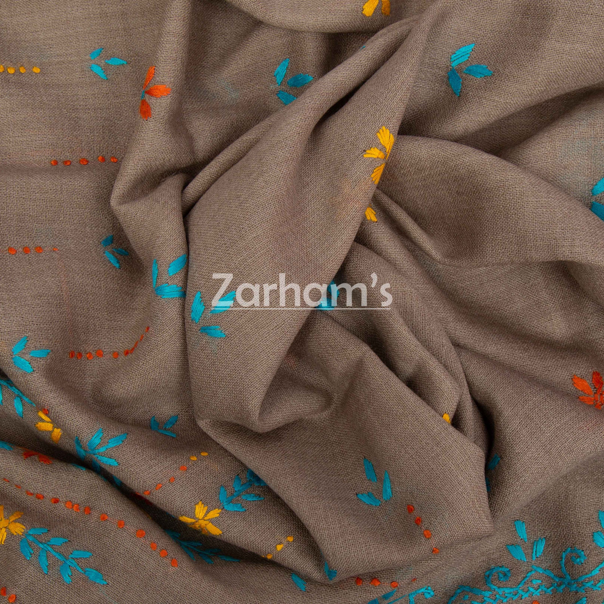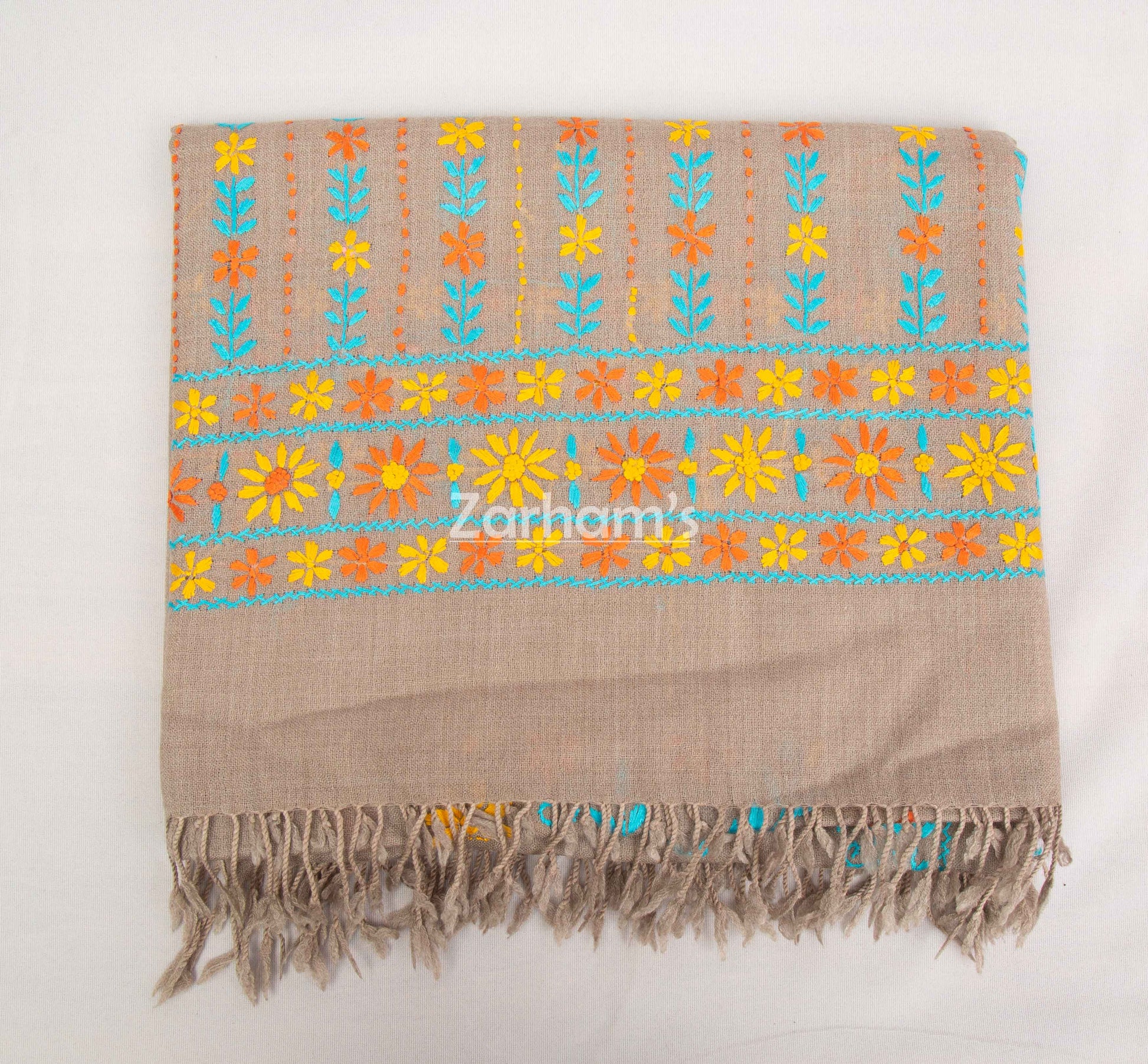 Wrap yourself in timeless elegance with our 100% handmade premium-quality pure woolen shawl, crafted in a rich Grey hue and adorned with intricate multicolor embroidery. Finished with delicate net work and a striking heavy border, this winter essential blends heritage craftsmanship with sophisticated style.